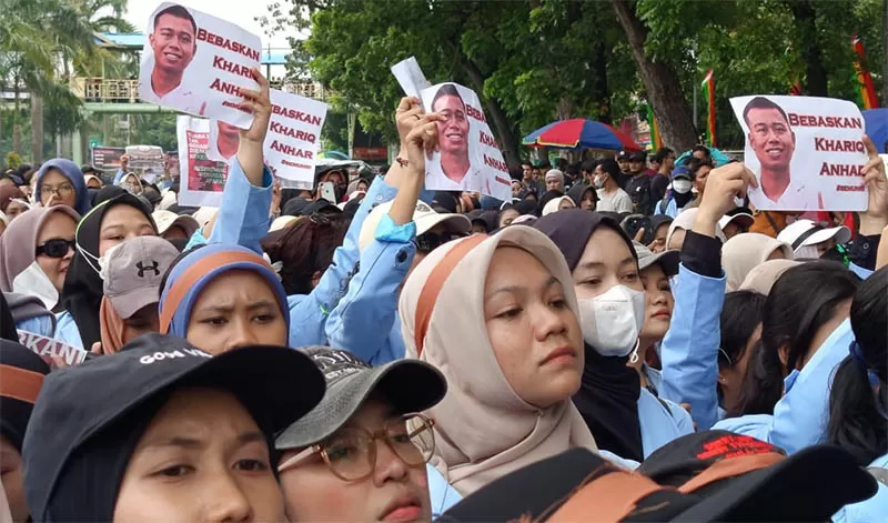 Mahasiswa Universitas Riau membawa flyer tuntutan pembebasan Khariq Anhar saat unjuk rasa di Gedung DPRD Riau, Senin (1/9/2025). (MHD AKHWAN/RIAUPOS.CO)
