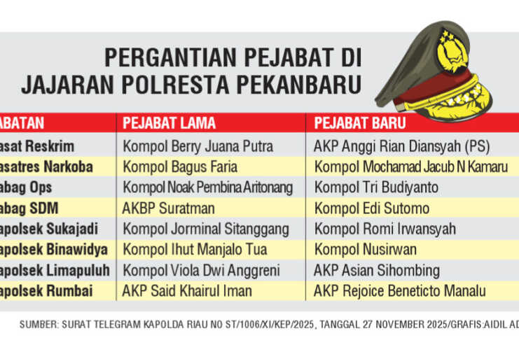Mutasi tersebut tertuang dalam Surat Telegram Kapolda Riau No ST/1006/XI/KEP/2025 tanggal 27 November 2025. Dalam surat itu tercantum perubahan pada posisi Kasatreskrim dan Kasatresnarkoba, disusul pemindahan dua kabag dan empat kapolsek di lingkungan Polresta Pekanbaru.