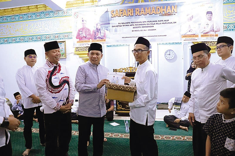 Pj Wako Pekanbaru Muflihun (tiga kiri) didampingi Sekko Indra Pomi Nasution (dua kiri) berikan bantuan saat Safari Ramadan di Masjid Al-Iradah, Jalan Ahmad Yani, Gang Terandam Kelurahan Pulau Karomah, Ahad (31/3/2024). (diskominfo pekanbaru untuk riau pos)
