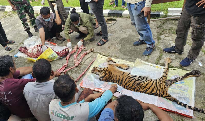 Hewan buas dilindungi itu dikuliti, daging dicacah, tulang-belulangnya masih merah ketika diamankan Tim Evakuasi Gabungan BBKSDA, TNI, Polri dan perangkat pemerintahan setempat, Senin (3/3).