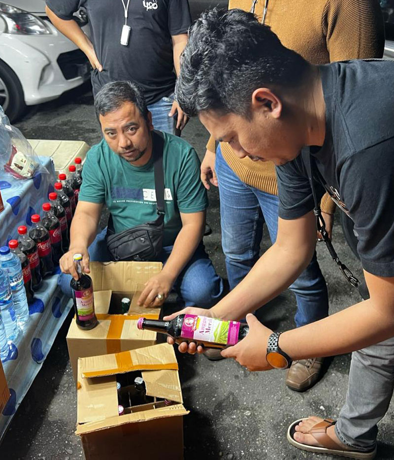 Personel Sat Narkoba Polresta Pekanbaru memeriksa dan menyita ratusan botol minuman keras (miras) yang menyalahi aturan, Ahad (3/3/2024) malam. (Humas Polresta Pekanbaru untuk riaupos.co)