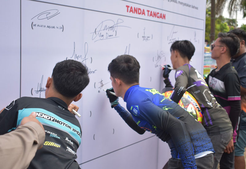 Para pembalap membubuhkan tanda tangan usai deklarasi antibalap liar, Ahad (3/3/2024) lalu. (Satlantas Polresta Pekanbaru untuk riaupos.co )