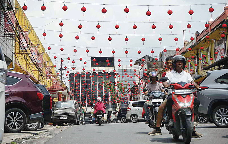 Pengendara melintas di bawah lampion perayaan Imlek yang dipasang di Jalan Dr Leimena atau Jalan Karet, Kecamatan Senapelan, Senin (5/2/2024). Tahun ini panitia sudah memasang sekitar 551 lampion untuk memeriahkan Imlek 2575 Kongzii/2024 Masehi. (EVAN GUNANZAR/RIUA POS)