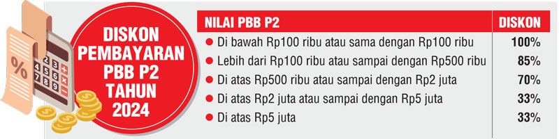 Kemudian untuk PBB P2 yang nilainya lebih dari Rp100 ribu sampai dengan Rp500 ribu diberikan pengurangan sebesar 85 persen. Selanjutnya PBB P2 yang besarannya di atas Rp500 ribu sampai Rp2 juta, diberikan pengurangan 70 persen.