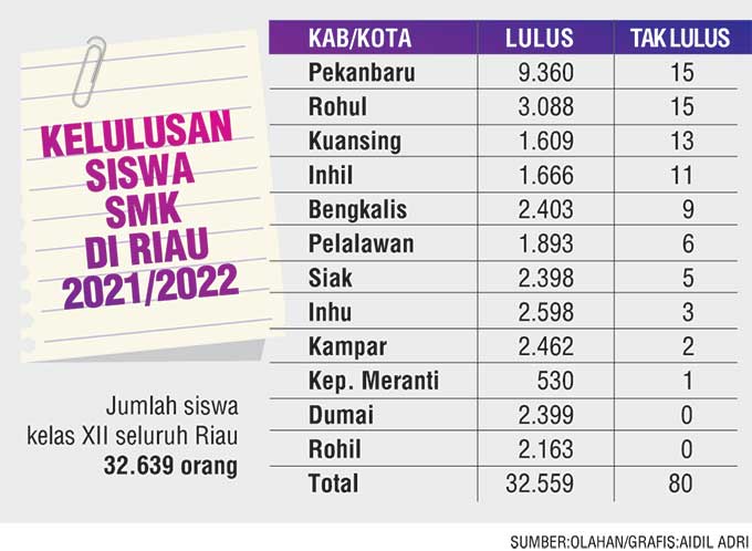Adapun jumlah siswa yang lulus tahun ini se-kabupaten/kota sebanyak 44.955 siswa dan yang tidak lulus 112 siswa. Sedangkan untuk jumlah siswa kelas XII seluruh Riau sebanyak 45.219 siswa.(sol)