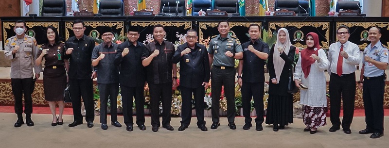 Wakil Ketua DPRD Riau Agung Nugroho (lima kanan), Gubri H Edy Natar Nasution (tengah), anggota DPRD Riau dan forkopimda berfoto bersama, Senin (5/2/2024). (humas dprd riau untuk riaupos.co)