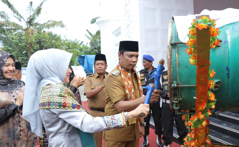 Pj Wako Pekanbaru Muflihun dan Ketua TP PKK Pekanbaru Raja Rilla Muflihun memukul beduk sebagai tanda dibukanya MTQ tingkat Kecamatan Rumbai Barat yang dipusatkan di Masjid Al Kastoeri, Kelurahan Agrowisata, Senin (5/2/2024). (diskominfo pekanbaru untuk riau pos)