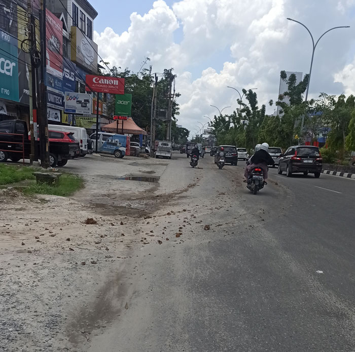 Seperti yang terlihat di Jalan Kaharuddin Nasution tidak jauh dari Pondok Patin, Ahad (5/5) sore dan di Jalan Tuanku Tambusai, Senin (6/5) siang. Terlihat sisa material tanah timbun mengotori kedua badan jalan tersebut.