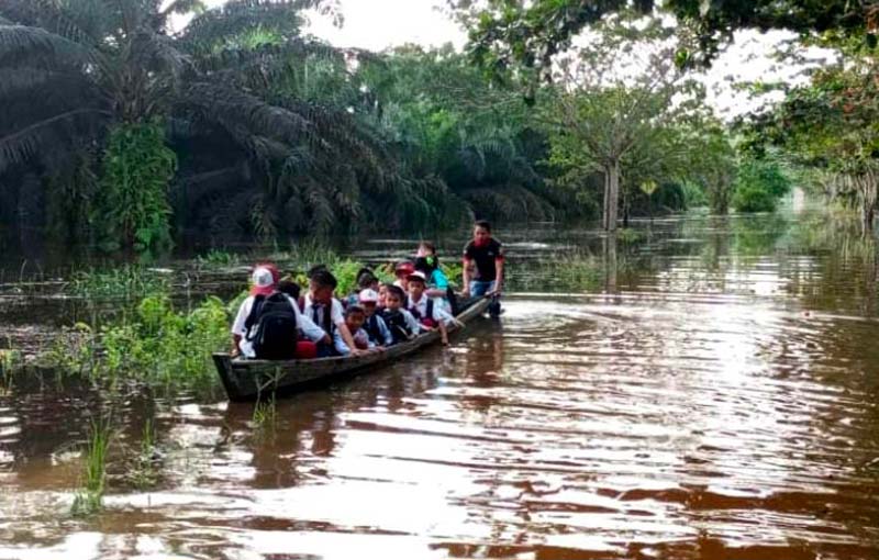 Murid-murid SD di Desa Sungai Ara, Kecamatan Pelalawan, Kabupaten Pelalawan menaiki sampan untuk berangkat ke sekolah, Senin (8/1/2024). (Muhammad Amin Amran/Riau Pos)