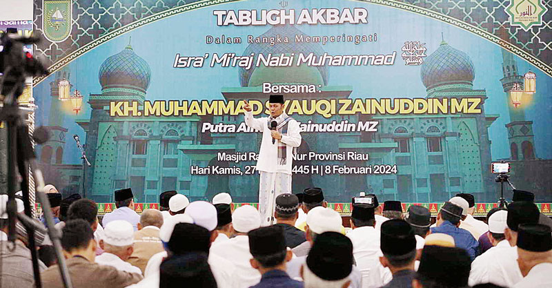 PEKANBARU (RIAUPOS.CO) – Pemerintah Provinsi (Pemprov) Riau melaksanakan peringatan Isra Mikraj Nabi Muhammad SAW di Masjid Raya An-Nur Provinsi Riau, Kamis (8/2). Pemprov Riau menghadirkan penceramah kondang KH Muhammad Syauqi MZ, yang merupakan anak dari almarhum ustaz terkenal KH Zainuddin MZ.
