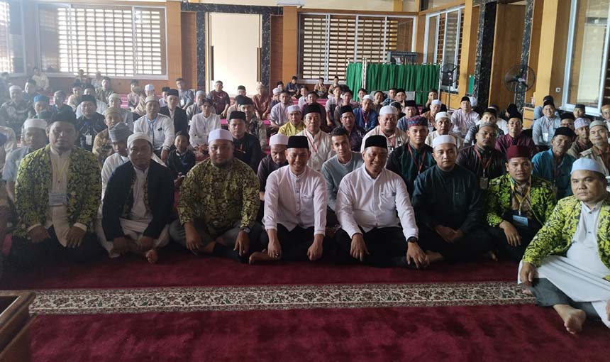 Peserta Pelatihan Akbar Imam dan Bilal yang diadakan DMI Kota Pekanbaru berfoto bersama usai kegiatan berlangsung di Masjid Nurul Ihsan, Sabtu (8/2/2025). DMI Kota Pekanbaru untuk Riau Pos
