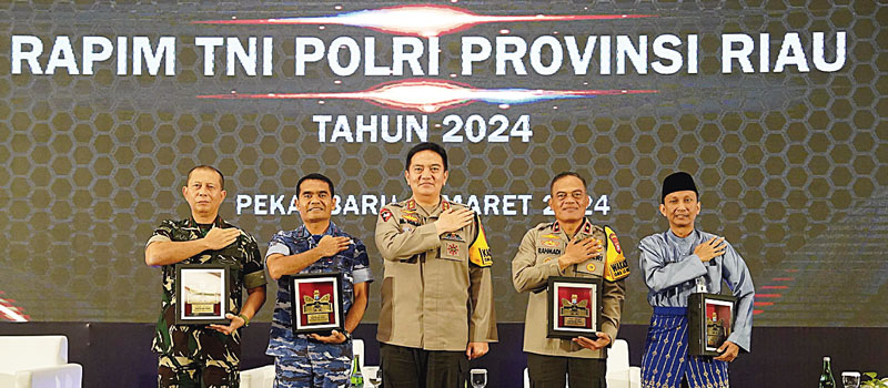 Kapolda Riau Irjen Pol Mohammad Iqbal (tengah) foto bersama Danrem 031/WB Brigjen TNI Dany Rakca Andalasawan (kiri), Danlanud Roesmin Nurjadin Marsma TNI Feri Yunaldi (dua kiri), Wakapolda Riau Brigjen Pol K Rahmadi (dua kanan), dan Plh Sekdaprov Riau Indra (kanan) saat Rapim TNI-Polri Polda Riau, Jumat (8/3/2024). (POLDA RIAU UNTUK RIAUPOS.CO)