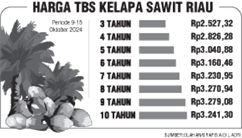 Kepala Dinas Perkebunan Provinsi Riau Syahrial Abdi mengatakan, kenaikan harga tertinggi berada di kelompok umur 9 tahun sebesar Rp38,58/kg atau mencapai 1,19 persen dari harga pekan lalu. Sehingga harga pembelian TBS petani untuk periode satu pekan ke depan naik menjadi Rp3.279,08/kg dan berlaku untuk periode satu pekan ke depan.