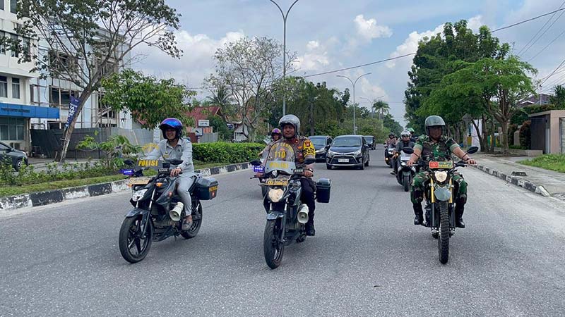 Kapolsek Lima Puluh Kompol Bagus Harry Priyambodo (tengah) mengajak Danramil Sail Kapten Arm Febrizal dan Camat Sail Farid Irwan Maulana saat melaksanakan patroli tiga pilar di wilayah hukum Polsek Lima Puluh, Jumat (9/2/2024). (POLRESTA PEKANBARU UNTUK RIAU POS)