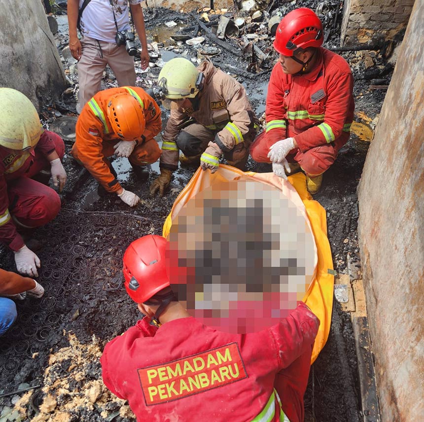 Petugas mengevakuasi jenazah korban kebakaran yang terjadi di Jalan Pontianak RT 02 / RW 08, Kelurahan Tangkerang Utara, Kecamatan Bukit Raya, Pekanbaru, Senin (10/2/2026).