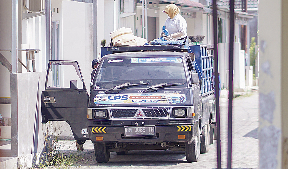 Pekerja yang tergabung kedalam Lembaga Pengelolaan Sampah Kecamatan Marpoyan sedang angkut sampah di pemukiman warga, Pekanbaru, Kamis (10/8/2025) ft: MHD AKHWAN/RIAUPOS