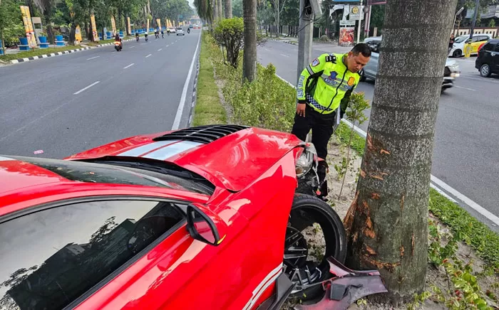 PEKANBARU (RIAUPOS.CO) – Sebuah mobil sport Ford Mustang berwarna hitam mengalami kecelakaan tunggal di Jalan Jenderal Sudirman, tepat di depan Hotel Batiqa Pekanbaru, Selasa (11/11/2025) pagi.