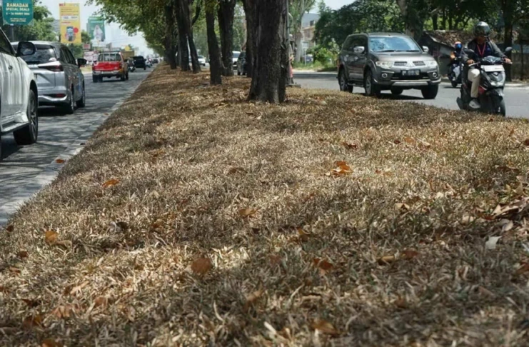 Tidak hanya rumput, beberapa pohon peneduh yang ditanam di median jalan juga mulai menunjukkan tanda-tanda kekeringan. Sejumlah daun tampak mengering dan rontok, sementara ranting-ranting kecil terlihat kehilangan kesegaran. Kondisi ini diduga terjadi akibat tingginya intensitas panas yang membuat tanaman lebih cepat kehilangan cadangan air.