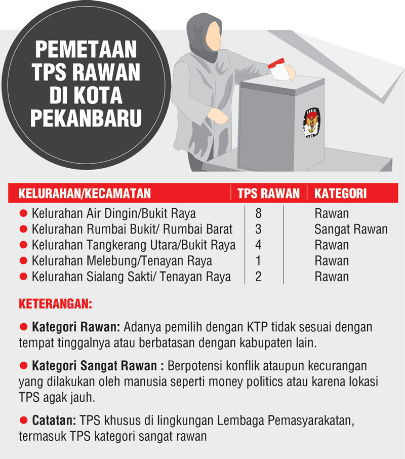 Kapolresta Pekanbaru juga menekankan perhatiannya pada sejumlah TPS rawan di Kota Pekanbaru. Ada belasan TPS yang dipetakan Polresta sebagai TPS rawan yang tersebar di Kelurahan Air Dingin, Kecamatan Bukit Raya dengan jumlah 8 TPS. Sementara di Kelurahan Rumbai Bukit, Kecamatan Rumbai Barat terdapat 3 TPS masuk kategori sangat rawan.