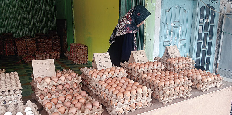 Pedagang menyusun telur ayam yang dijual di Jalan Tengku Bey, Kecamatan Bukit Raya, Rabu (14/2/2024). Harga telur mencapai Rp50 ribu per papan (30 butir), naik dari harga sebelumnya Rp48 ribu. (prapti Dwi Lestari/riau pos)