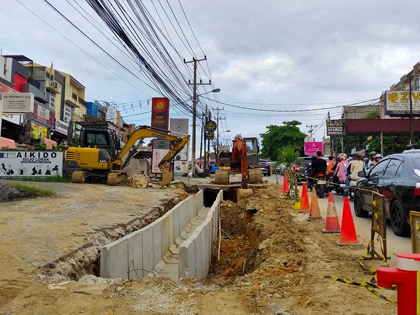 Progres perbaikan drainase di Jalan Lobak, Kecamatan Binawidya, Senin (14/4/2025). EVAN GUNANZAR/RIAU POS