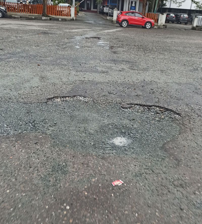Dofi Iskandar/riau pos LUBANG: Kondisi jalan yang berlubang di Jalan Cut Nyak Dhien, tepatnya di u-turn dekat Kantor Dinas Pendidikan Riau atau depan Kantor Bulog Riau, Kamis (15/2/2024).