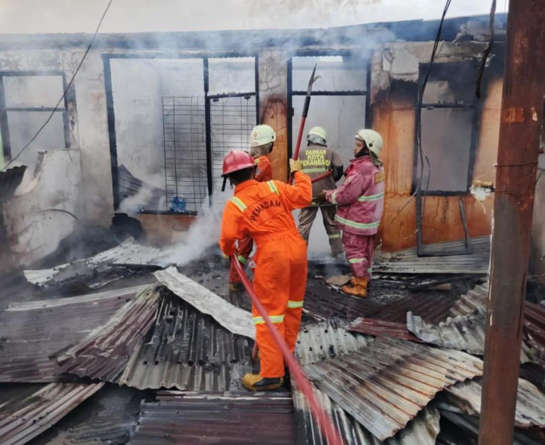 Petugas tengah melakukan proses pemadaman api yang membakar empat bangunan di Jalan Sari Kencana, Kelurahan Tangkerang Tengah, Kecamatan Marpoyan Damai, Ahad (16/11/2025) pagi. Damkar Pekanbaru untuk rRau Pos