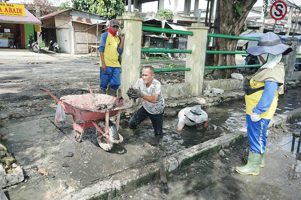 Sejumlah pekerja membersihkan drainase dari endapan lumpur dan sampah di depan Pasar Cik Puan, Pekanbaru, Jalan Tuanku Tambusai, Selasa (16/12/2025). EVAN GUNANZAR/RIAU POS