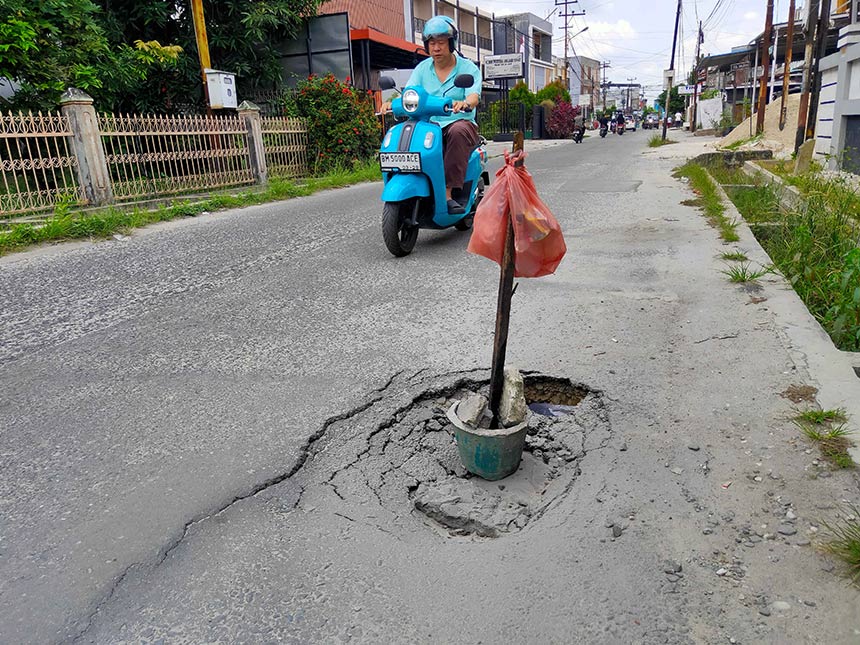 Warga memberi tanda di Jalan Garuda yang rusak dan berlubang, Senin (17/2/2025). EVAN GUNANZAR/RIAU POS