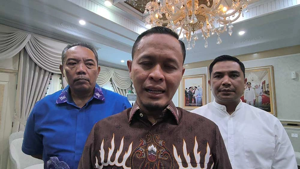 Wali Kota Pekanbaru Agung Nugroho didampingi Pj Sekko Pekanbaru Ingot Ahmad Hutasuhut dan Inspektur Pekanbaru Zulhelmi Arifin memberikan keterangan pers usai rapat bersama Forkopimda Pekanbaru, Selasa (17/2/2026).