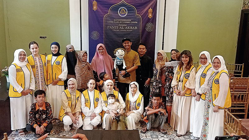 Anggota Lions Club Jakarta Cosmo Charm foto bersama para anak yatim-piatu dari Panti Asuhan Al Akbar saat mengadakan buka puasa bersama, Sabtu (16/3/2024). ( prapti Dwi Lestari/riaupos.co)