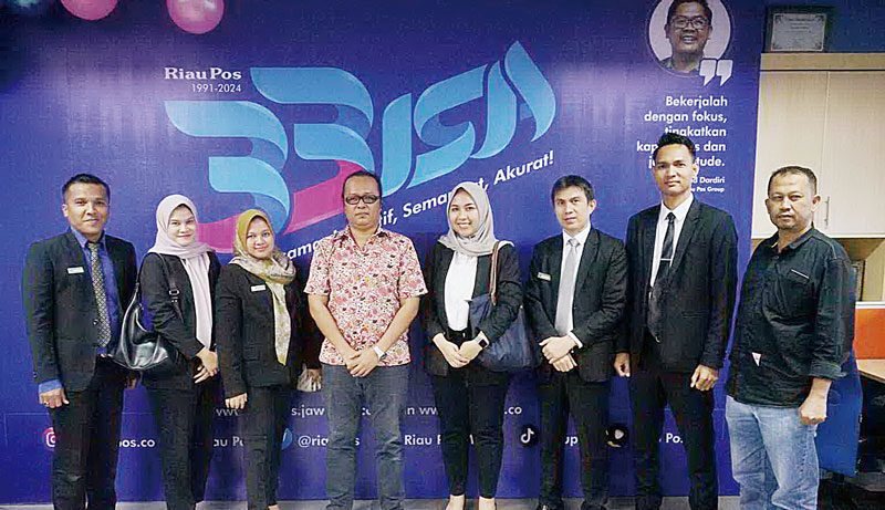 Director Of Sales Mutiara Merdeka Hotel Silvana, HRD Manager Mutiara Merdeka Delita, Sales Executive Mutiara Merdeka Vania, Asisten Restaurant Manager Mutiara Merdeka Rahmad, Asisten Manager Houskeeping Mutiara Merdeka Hengki dan Sales Executive Mutiara Merdeka Haris disambut hangat Direktur Utama Riau Pos Ahmad Dardiri bersama Direktur juga Pemimpin Redaksi (Pemred) Riau Pos Firman Agus, Jumat (19/1).