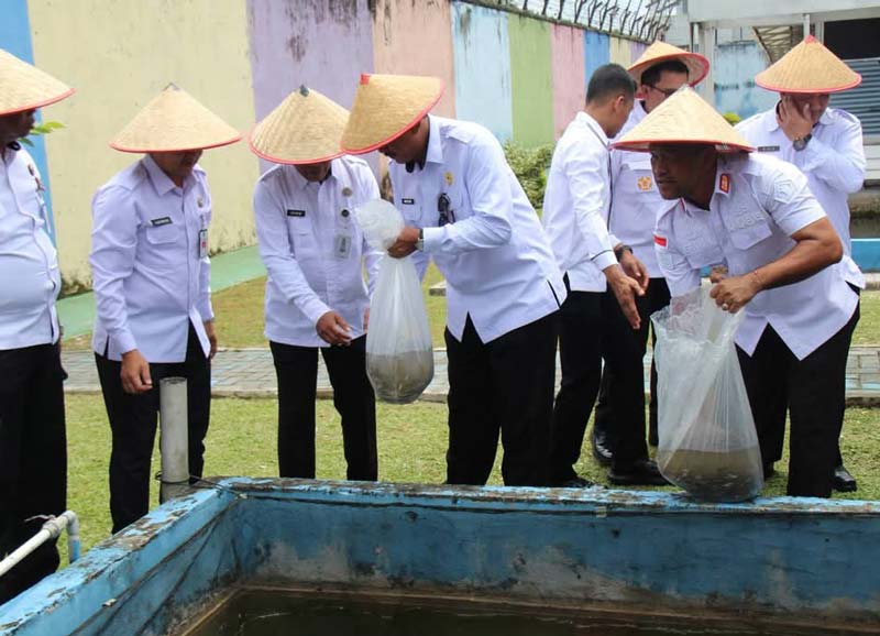 Pelepasan benih ikan patin di kolam Lapas Kelas IIA Pekanbaru, Rabu (19/2/2025).