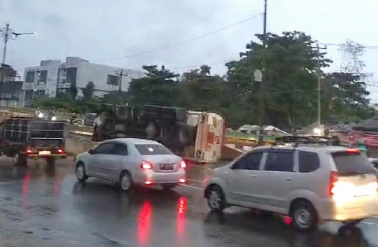 PEKANBARU (RIAUPOS.CO) – Sebuah truk tangki pengangkut bahan bakar minyak (BBM) terguling di flyover Jalan Jenderal Sudirman, Pekanbaru, Kamis (19/2) sekitar pukul 06.00 WIB, setelah menabrak pembatas jalan di depan RS Awal Bros.