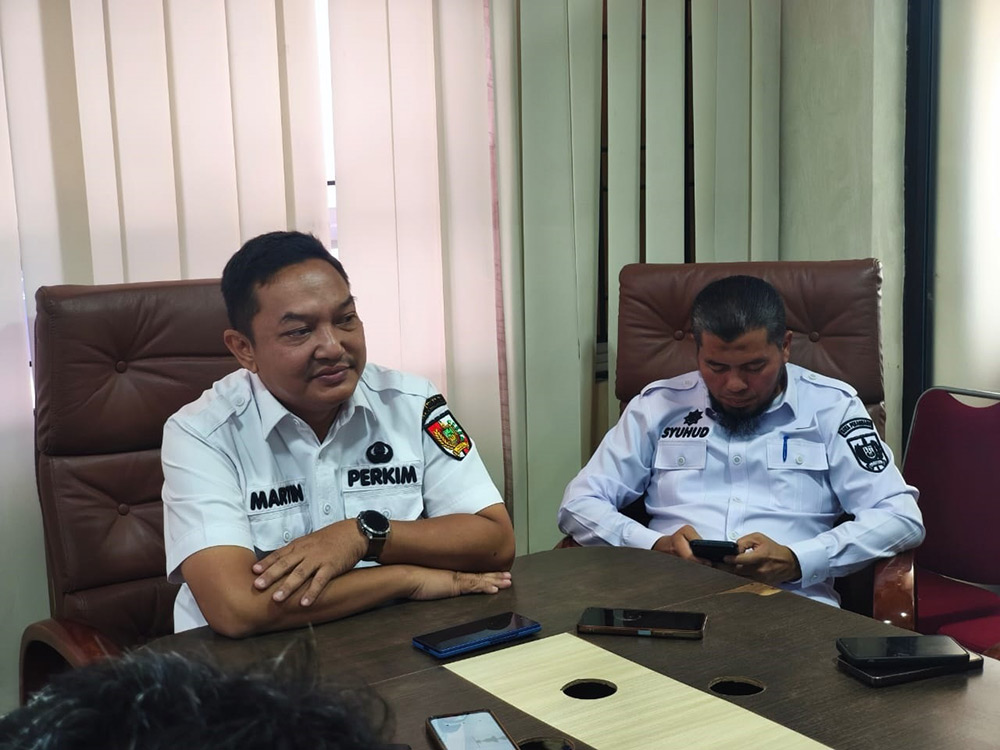 Plt Kadis Perkim Pekanbaru Martin Manouluk didampingi Plt Kadiskominfo Pekanbaru M Syuhud memberikan keterangan pers di MPP Pekanbaru, Rabu (19/11/2025). M ALI NURMAN/riau pos