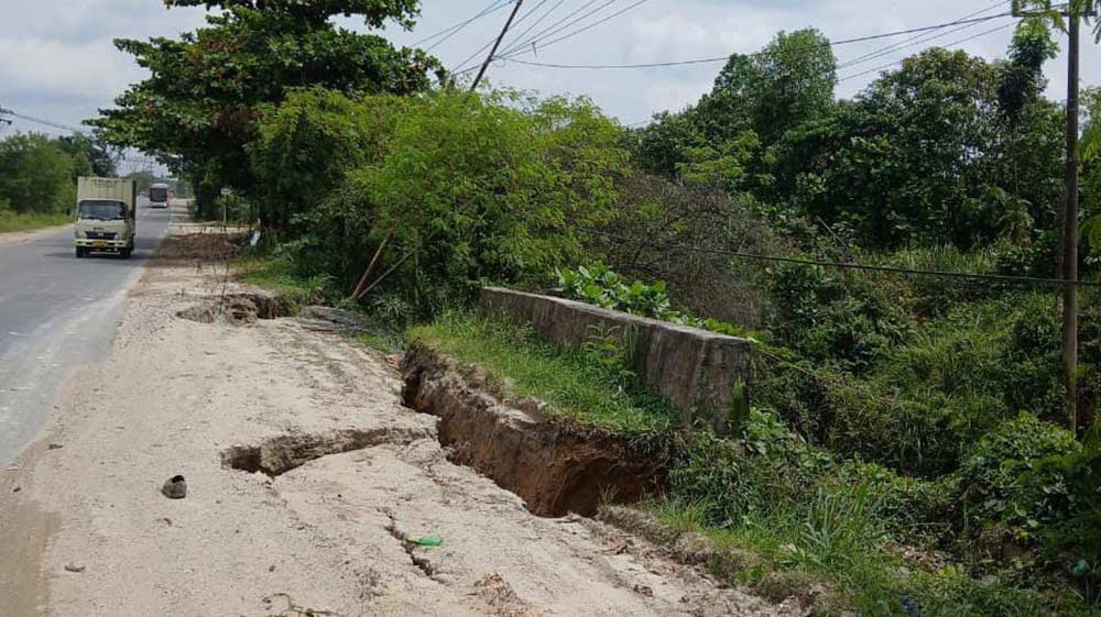 Pantauan di lapangan, Selasa (20/1), bahu jalan yang amblas terlihat cukup parah hingga membentuk lubang dalam dan menganga. Kerusakan tersebut berada persis di aliran Sungai Umban, membuat bahu jalan semakin menyempit dan berada sangat dekat dengan arus lalu lintas yang cukup padat.