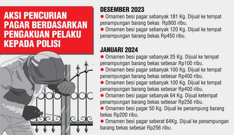 Kapolsek menjelaskan, aksi pencurian itu tidak dilakukan sekali. Namun terus berulang hingga delapan kali. Diketahui rumah sasaran pencurian pagar besi tersebut tidak berpenghuni sejak tiga bulan terakhir.
