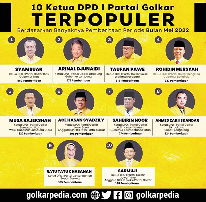 Ketua DPD I Golkar Riau Syamsuar berhasil menempati posisi pertama atau terpopuler dengan jumlah 862 pemberitaan. Sementara diposisi kedua diraih oleh Ketua DPD I Golkar Lampung Arinal Djunaidi dengan 772 pemberitaan dan posisi ketiga diraih ketua DPD I Golkar Sulawesi Selatan dengan 512 pemberitaan.