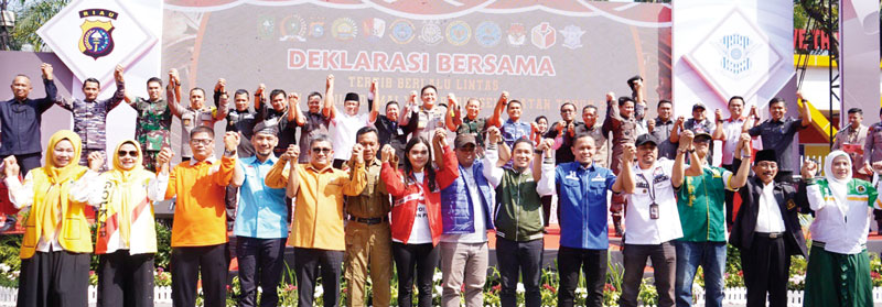 PEKANBARU (RIAUPOS.CO) – Kepolisian Daerah (Polda) Riau melalui Direktorat Lalu Lintas (Ditlantas) menggelar deklarasi bersama tertib lalu lintas berkeselamatan guna mewujudkan Pemilu Damai 2024, Ahad (21/1) pagi. Deklarasi ini mengajak seluruh peserta pemilu untuk selalu tertib saat melaksanakan kampanye terbuka. Kegiatan yang dipimpin langsung Kapolda Riau Irjen Pol Mohammad Iqbal ini diselenggarakan di depan Kantor Komisi Pemilihan Umum (KPU) Provinsi Riau, Jalan Gajah Mada, Pekanbaru.
