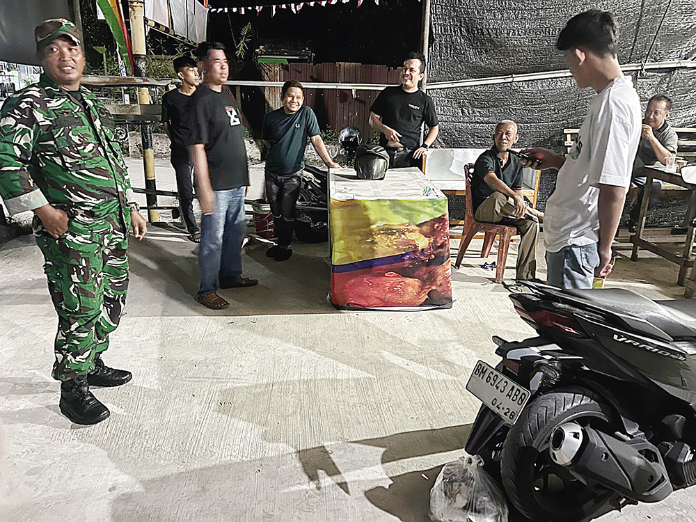 Seorang pemuda (kaos putih) ditangkap pemuka masyarakat saat buang sampah di Jalan Kutilang Sakti, Kecamatan Binawidya, Pekanbaru, Kamis (21/8/2025) dini hari.