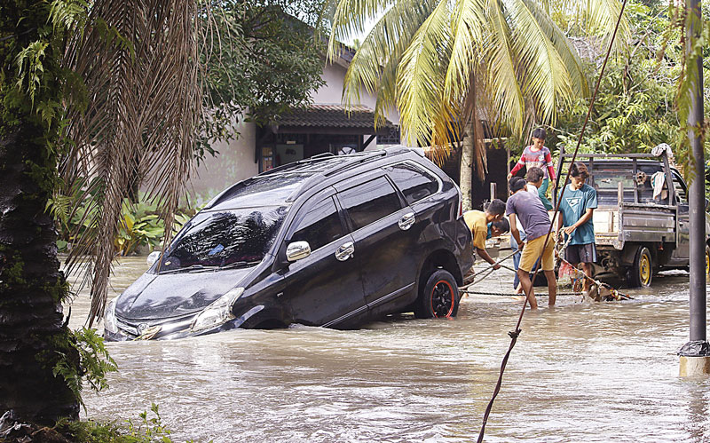 Warga mengevakuasi mobil MPV yang terperosok ke dalam saluran air dampak terseret arus di Jalan Gelatik, Perumahan Sidomulyo, Marpoyan Damai, Kamis (22/2/2024). (MHD AKHWAN/RIAU POS )