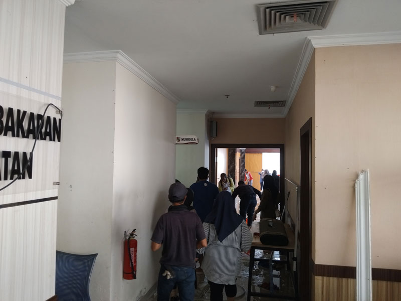 ”Gotong-royong, bersih-bersih dululah. Pastinya kami bersiap-siap pindah ke gedung pemadam ini,” ujar Dian, salah seorang ASN yang turut mengepel lantai. Pekerjaan bersih-bersih sudah dilakukan mereka sejak pagi. Tak hanya di dalam, area bagian luar gedung juga sedang dibersihkan. Seratusan petugas kebersihan dari internal Dinas PUPR diturunkan untuk membersihkan pekarangan. Sebagian mereka membersihkan paritnya dan meratakan tanahnya.