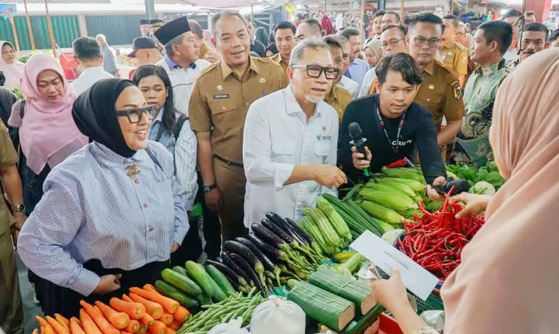 Menteri Perdagangan Zulkifli Hasan (tengah) berdialog dengan pedagang di Pasar Palapa Pekanbaru, Senin (24/6/2024). (DEFIZAL / Riau Pos)