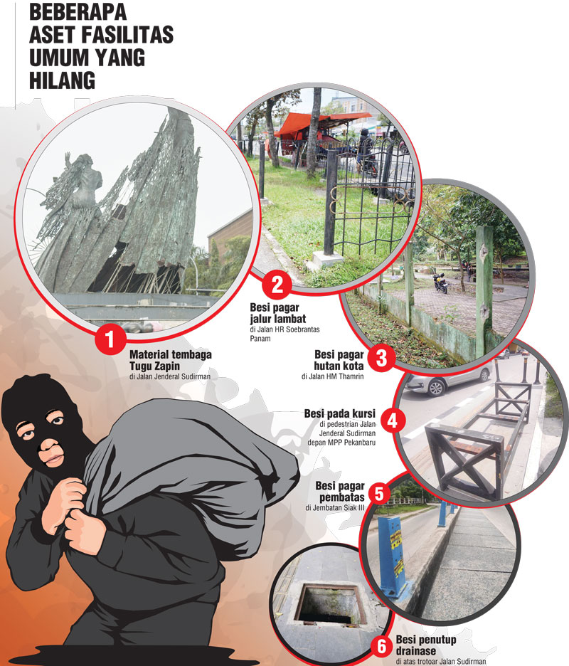 Beberapa aset fasum yang hilang diduga dicuri tersebut di antaranya kursi besi yang terpasang di jalur pedestrian Jalan Jenderal Sudirman. Lalu, besi penutup selokan atau penutup lubang di jalur pedestrian Jalan Jenderal Sudirman tepatnya di depan Kantor Mal Pelayanan Publik (MPP) Pekanbaru.
