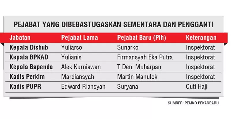 Kepala Badan Kepegawaian dan Pengembangan Sumber Daya Manusia (BKPSDM) Kota Pekanbaru, Irwan Suryadi, menjelaskan bahwa para pejabat yang dibebastugaskan tersebut adalah: