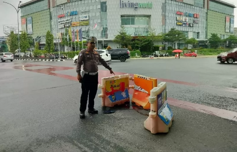 Petugas Satlantas Polresta Pekanbaru menunjukkan lokasi korban terjatuh dari Flyover Simpang SKA Pekanbaru. (Satlantas Polresta Pekanbaru)