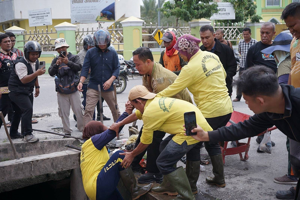 S: Wali Kota Pekanbaru Agung Nugroho membantu petugas kebersihan naik dari parit saat meninjau lokasi beberapa drainase di Pekanbaru