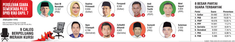 PEKANBARU (RIAUPOS.CO) – Perebutan 8 kursi Pemilihan Legislatif (Pileg) DPRD Riau Daerah Pemilihan (Dapil) 7, wilayah Kabupaten Indragiri Hilir (Inhil) memperlihatkan persaingan sengit antara Partai Golkar dan PKB. Dua partai ini bercokol di posisi puncak.