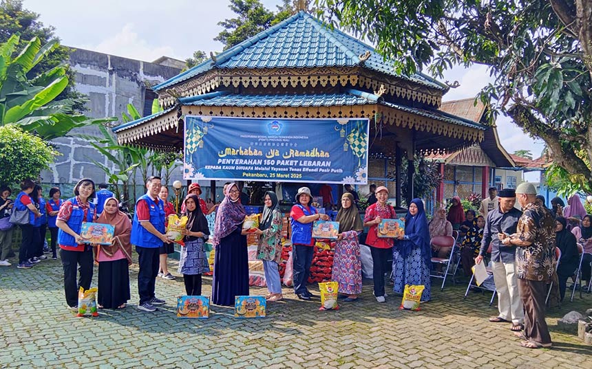 Pengurus PSMTI Riau foto bersama perwakilan Yayasan Tenas Effendy dan masyarakat saat penyerahan paket Idulfitri, Kamis (27/3/2025). Psmti riau untuk riau pos