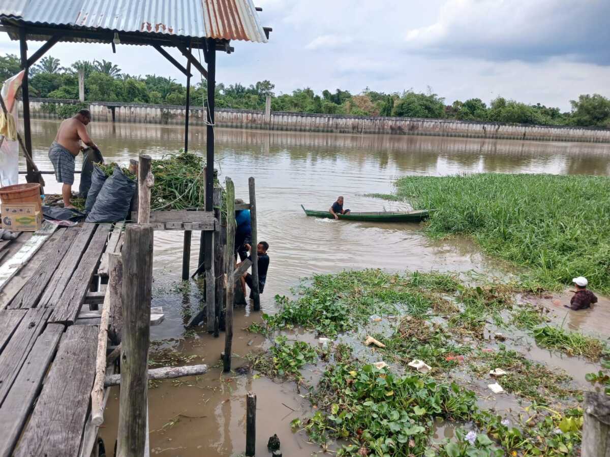 Komunitas Masyarakat Peduli Sungai saat membersihkan Sungai Siak dari eceng gondok dan sampah, Sabtu (26/7/2025).